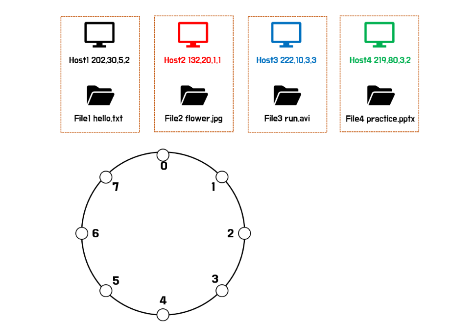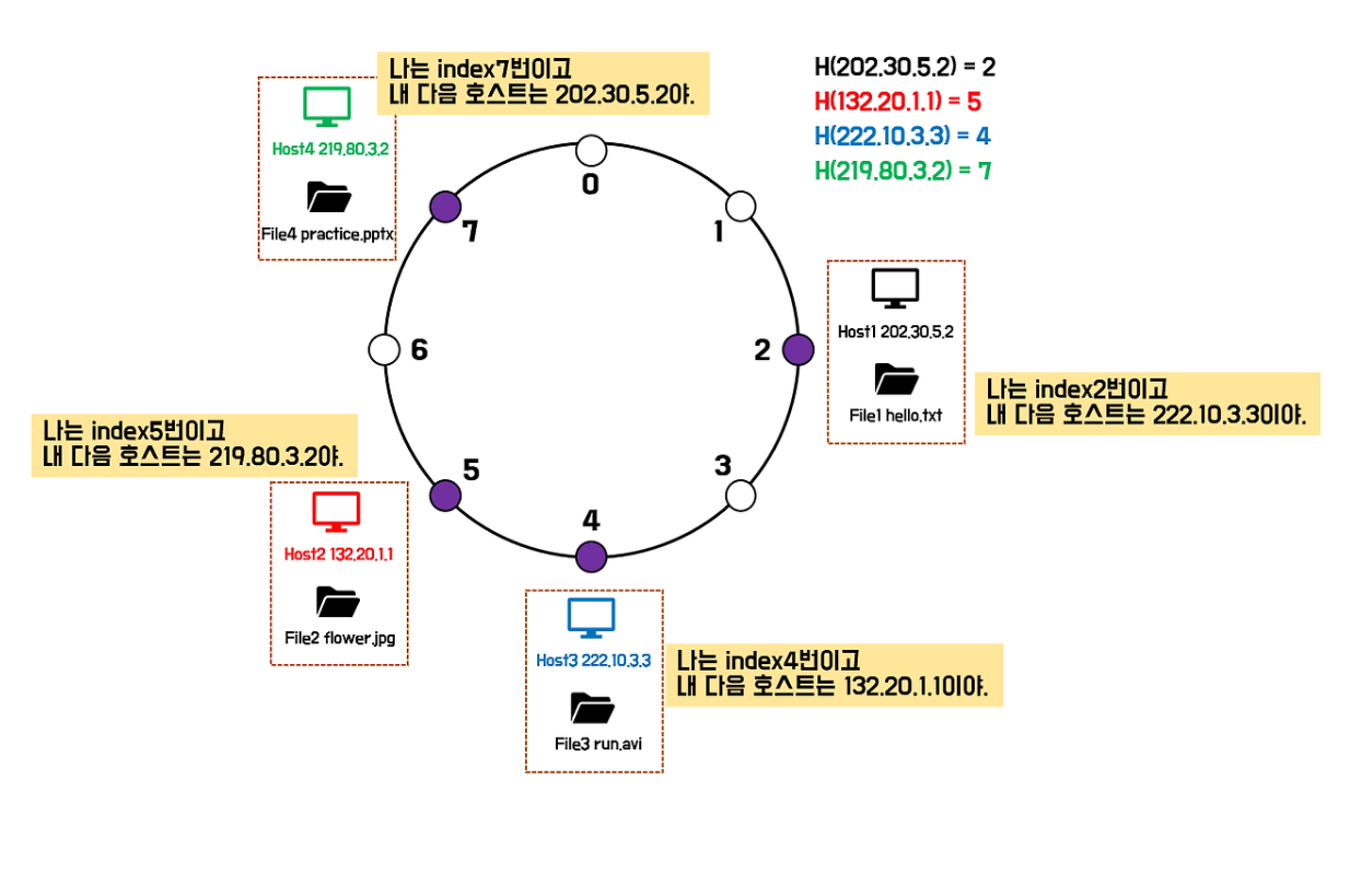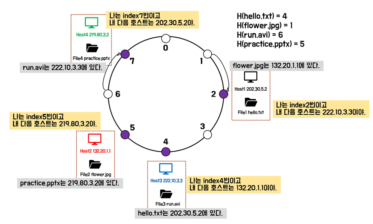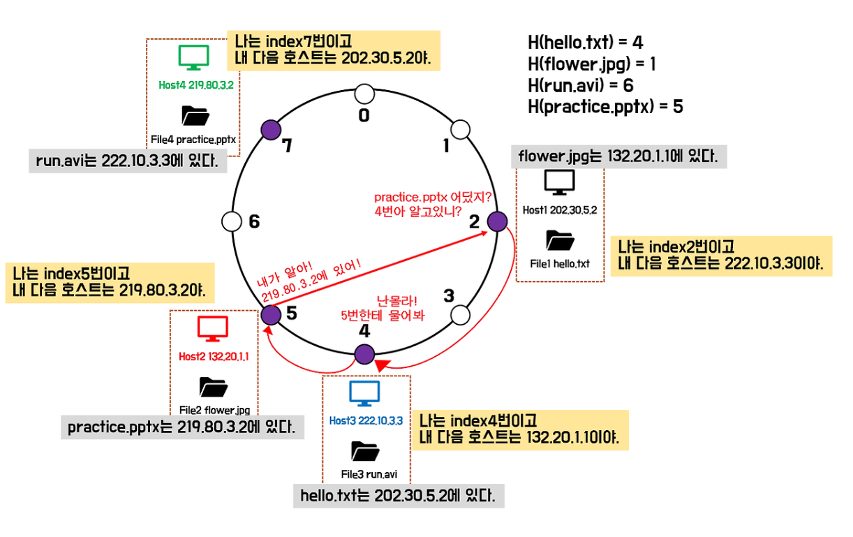 위의 그림에서 해시함수를 통해 index2를 구했다. 'hello.txt'의 해시함수 결과는 4 이므로 4번 index를 가진 Host3이 'hello.txt'의 위치를 알고 있으면 된다.
