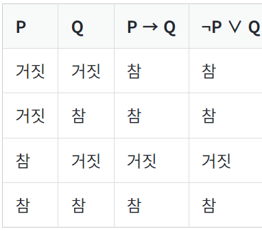 4. 함축( (P → Q) )“P이면 Q이다”: P가 거짓이면 (P → Q) 는 항상 참이다, P가 참이면 (P → Q)은 Q의 진리값을 따른다.