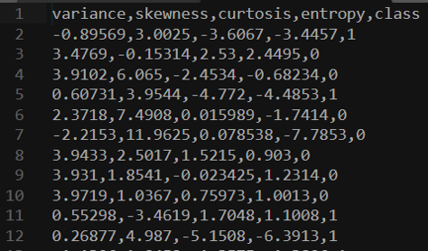 예를 들어 맨 위에서 위조지폐의 데이터세트를 다운로드하여 사용해 보자.
