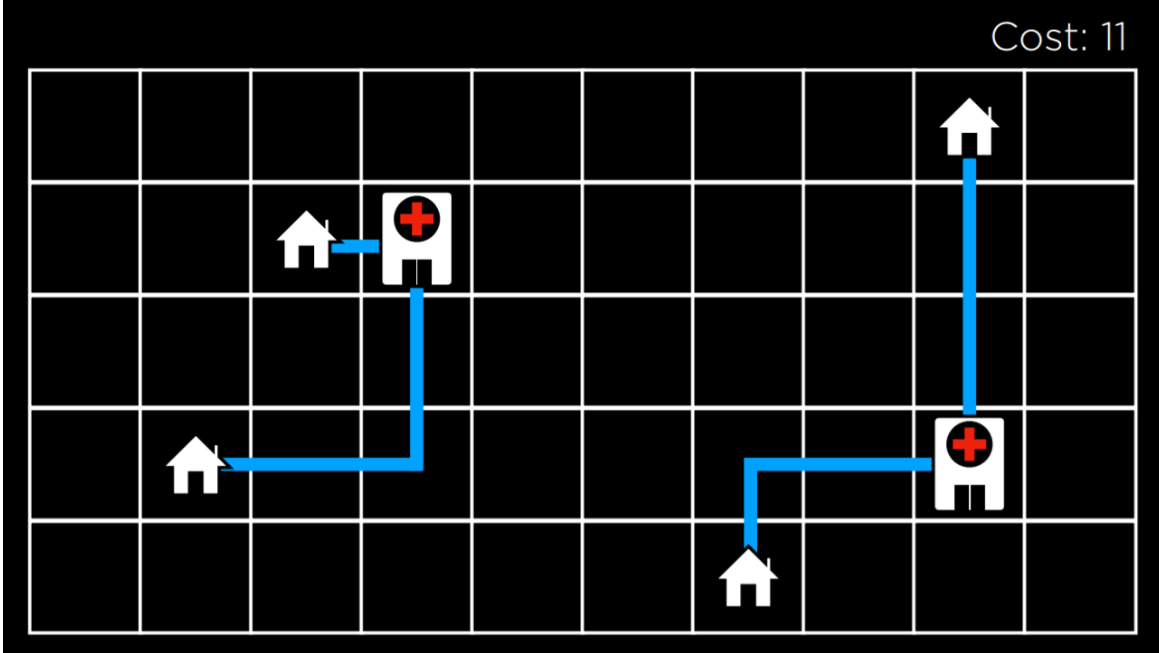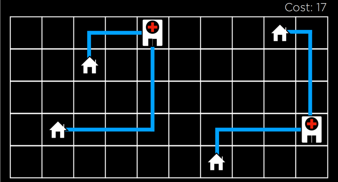 이 그림에서는 주택과 병원의 가능한 구성을 볼 수 있다. 이들 사이의 거리는 맨해튼 거리(위, 아래, 측면으로 이동한 횟수)를 사용하여 측정되며, 각 집에서 가장 가까운 병원까지의 거리의 합은 17(왼쪽:9, 오른쪽:8)이고, 우리는 이를 비용이라 부른다. 우리가 이 거리를 최소화하려고 노력하기 때문이다. 이 경우 state는 주택과 병원의 단일 구성이 된다.