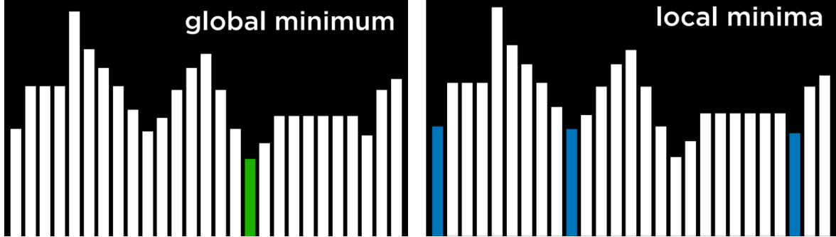 위에서 언급한 것처럼 언덕 오르기 알고리즘들은 극댓값들 또는 극솟값들에 갇힐 수 있다.