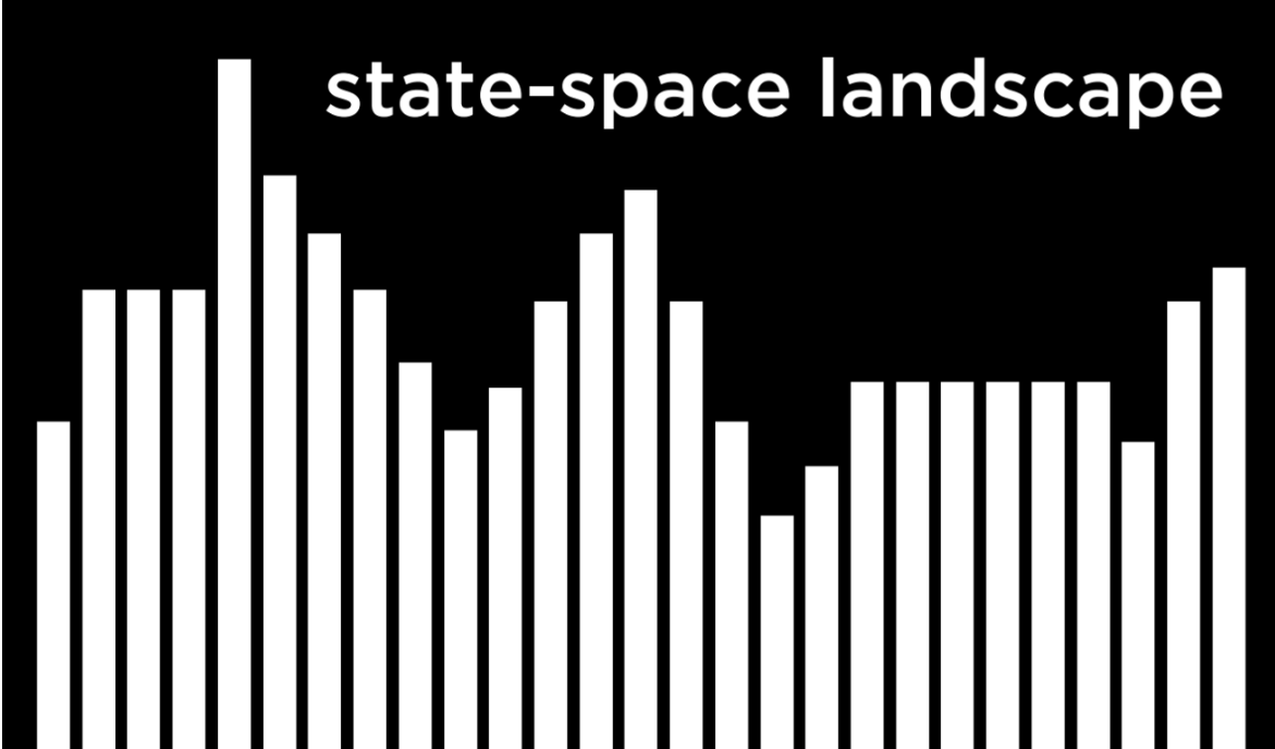 이 개념을 추상화하면 주택과 병원의 각 구성을 아래의 상태공간 풍경으로 표현할 수 있다. 그림의 각 막대는 state의 가치를 나타내며, 이 예에서는 주택과 병원의 특정 구성에 대한 비용이 된다.