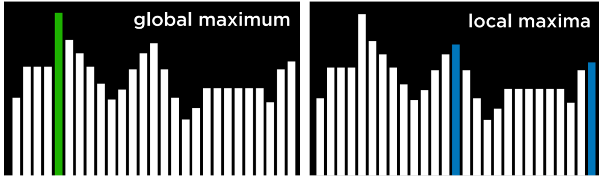 극댓값(local maximum (plural: maxima))은 이웃한 상태들보다 높은 값을 갖는 상태이고, 최댓값(global maximum)은 상태 공간의 모든 상태 중에서 가장 높은 값을 갖는 상태다.(고등수학 2 내용과 같다.)
