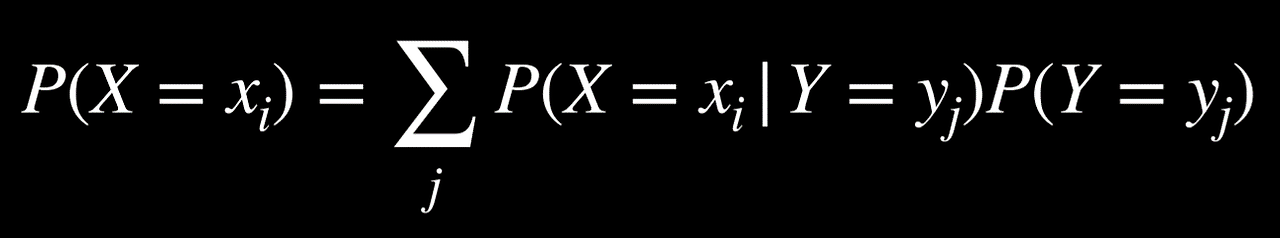 이 공식에서 확률 변수 X는 확률 변수 Y의 각 값에 해당 값을 취하는 변수 Y의 확률을 곱한 xᵢ 확률의 합과 동일한 확률로 xᵢ 값을 취한다. P(a | b) = P(a, b)/P(b )를 기억하면 이는 의미가 있다. 이 식에 P(b)를 곱하면 P(a, b)가 되고여기서부터는 조건화에서와 동일한 작업을 수행하면 된다.