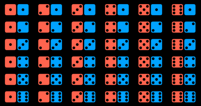 이제 주사위 두 개를 굴리는 경우를 생각해 보자. 이제 36가지의 가능한 사건이 있으며, 역시 확률은 동일하다.