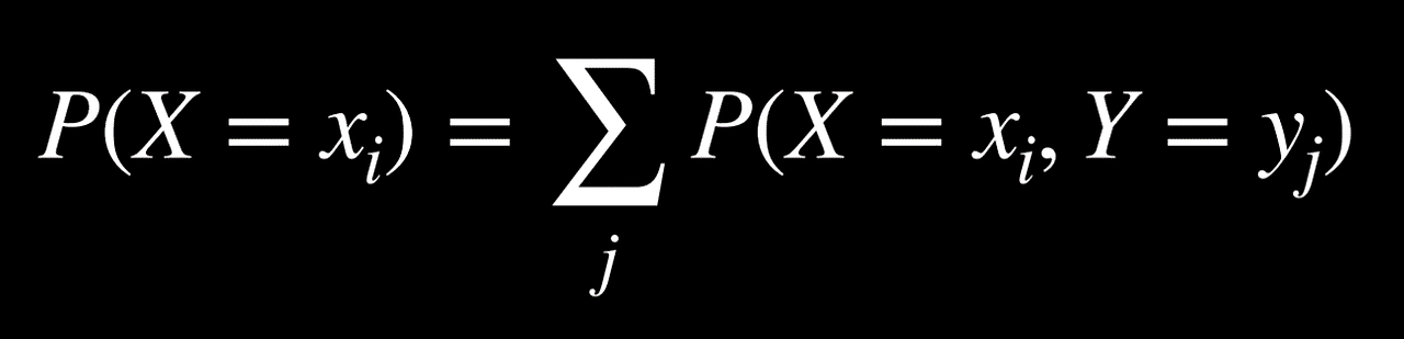 주변화: P(a) = P(a, b) + P(a, ¬b). 여기서의 아이디어는 b와 ¬b가 분리된 확률이라는 것이다. 즉, b와 ¬b가 동시에 발생할 확률은 0이다. 우리는 또한 b와 ¬b의 합이 1인 것도 알고 있다. 따라서 a가 발생하면 b가 발생하거나 발생하지 않을 수 있다. a와 ¬b의 확률에 더해 a와 b가 모두 발생할 확률을 취하면 단순히 a의 확률로 끝난다. 주변화는 확률 변수에 대해 다음과 같은 방식으로 표현될 수 있다.주변화 방정식