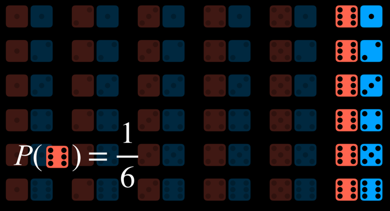 예를 들어, P(합계 12 | 하나의 주사위에 6 나옴) 또는 우리가 이미 하나의 주사위를 굴려 6을 얻었다면 두 개의 주사위를 굴려 합이 12가 될 확률을 생각해 보자. 이를 계산하기 위해 먼저 첫 번째 주사위의 값이 6인 세계로 세계를 제한한다.