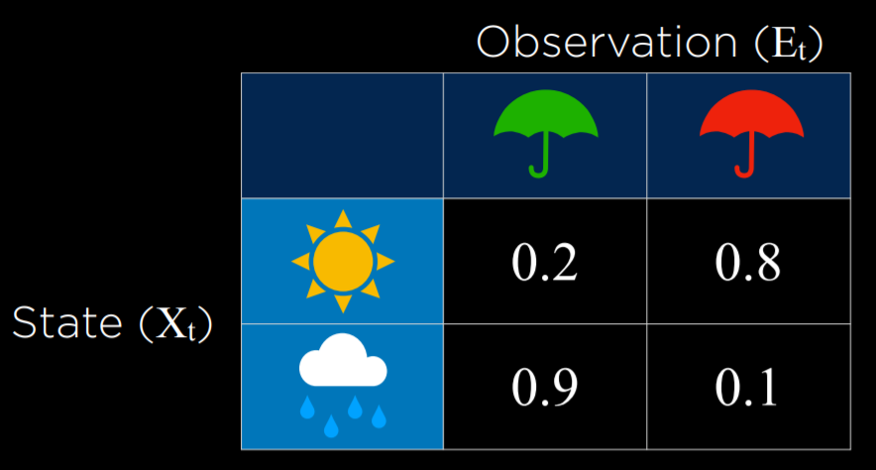 다음 예시를 보자. 우리의 AI는 날씨(숨겨진 상태)를 추론하고 싶어 하지만 얼마나 많은 사람들이 우산을 가져왔는지 기록하는 실내 카메라에만 액세스 할 수 있다. 다음은 이러한 확률을 나타내는 센서 모델 (방출(emission) 모델 이라고도 함)이다: