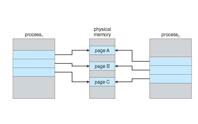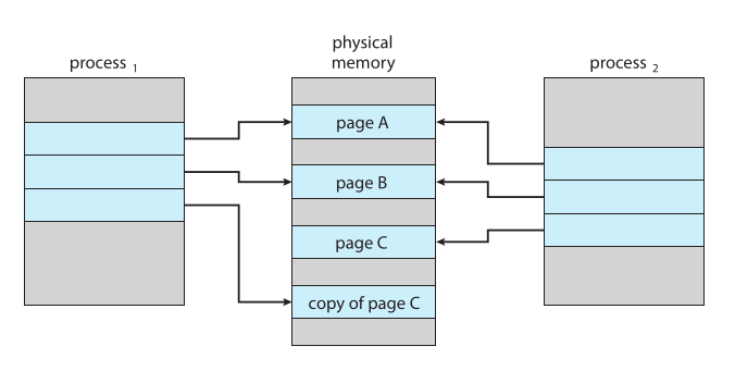 - 이러한 공유 페이지는 COW로 표시된다. 즉, 프로세스 중 하나가 공유 페이지에 기록되면 공유 페이지의 복사본이 생성된다.