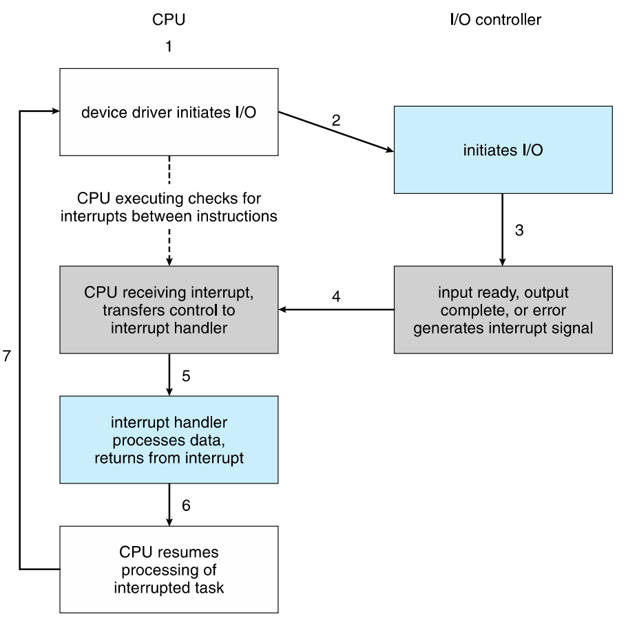 (1) I/O에게 명령 보내기(CPU) >>> ( CPU가 명령어 간의 인터럽트가 있는지 확인 )>>> (2)