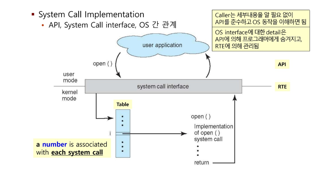 실제로 API를 이루는 함수들은 System calls을 호출하여 application programmer에게 도움을 준다. system-interface는 API의 function-call을 가로채어 필수적인 system calls을 OS에게 호출한다. 이후 system call 상태를 반환한다.
