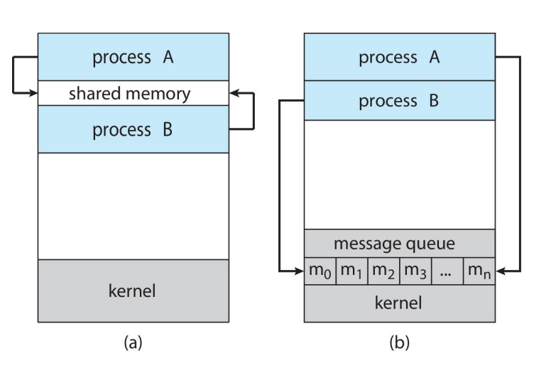 • 메시지 넘기기: message passing방식에서는, message교환을 통해 정보를 주고받는다. (b)