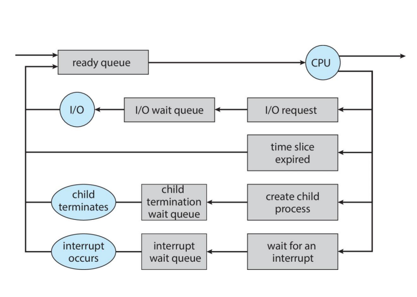 • Ready queue – 메인 메모리에 상주하고 준비되어 실행을 기다리는 모든 프로세스 집합